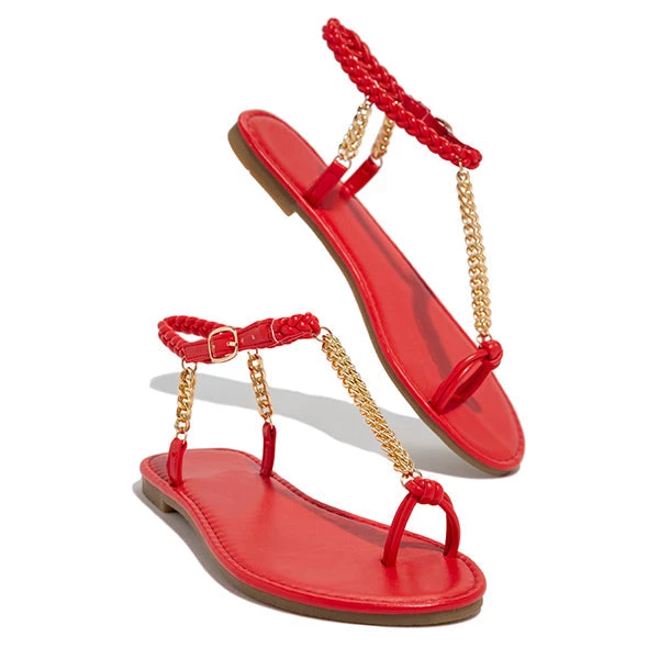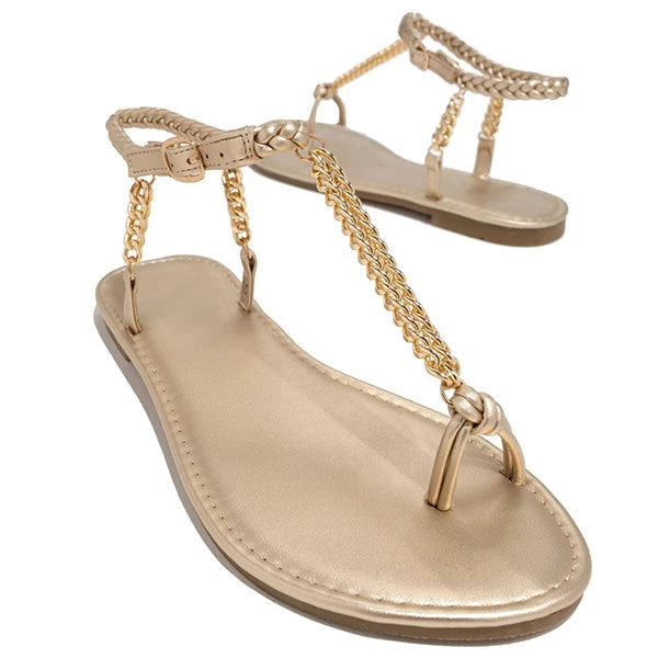 Mollyshoe Gold-Tone Chain Braided Ankle Strap Toe Loop Sandals
