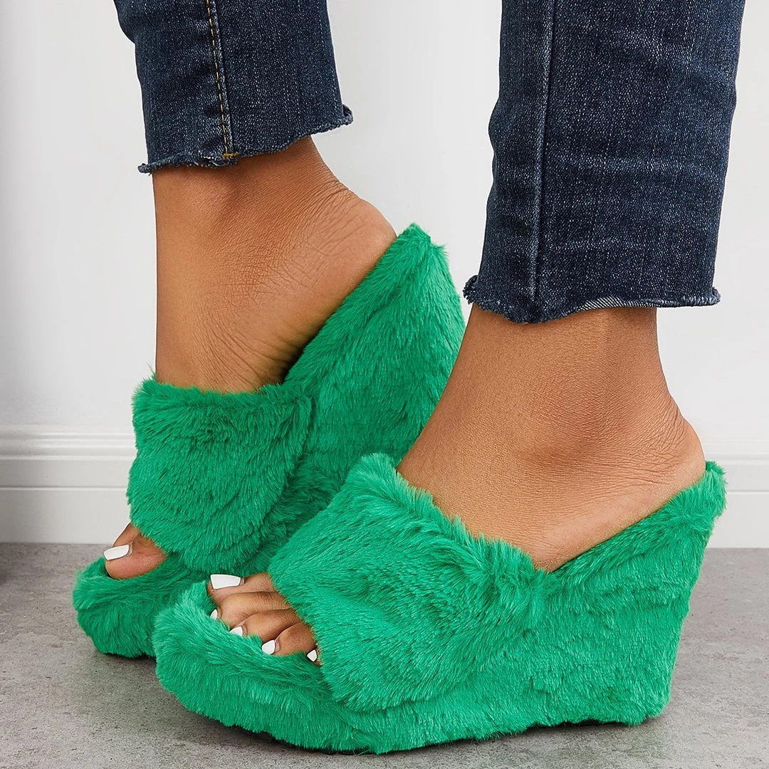 Mollyshoe Round Toe Fluffy Wedge Slippers
