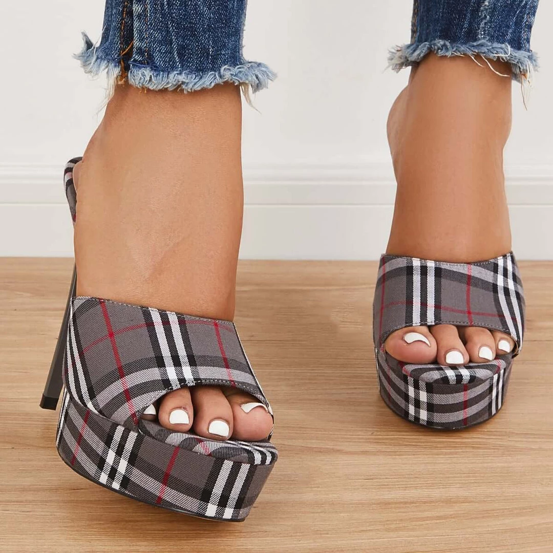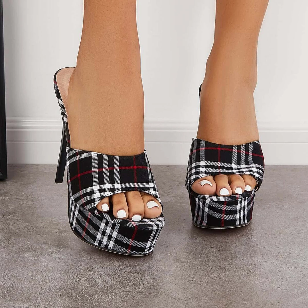 Mollyshoe Women’s Open Toe Plaid Stilettos Thin Heels Slip-on Sandals